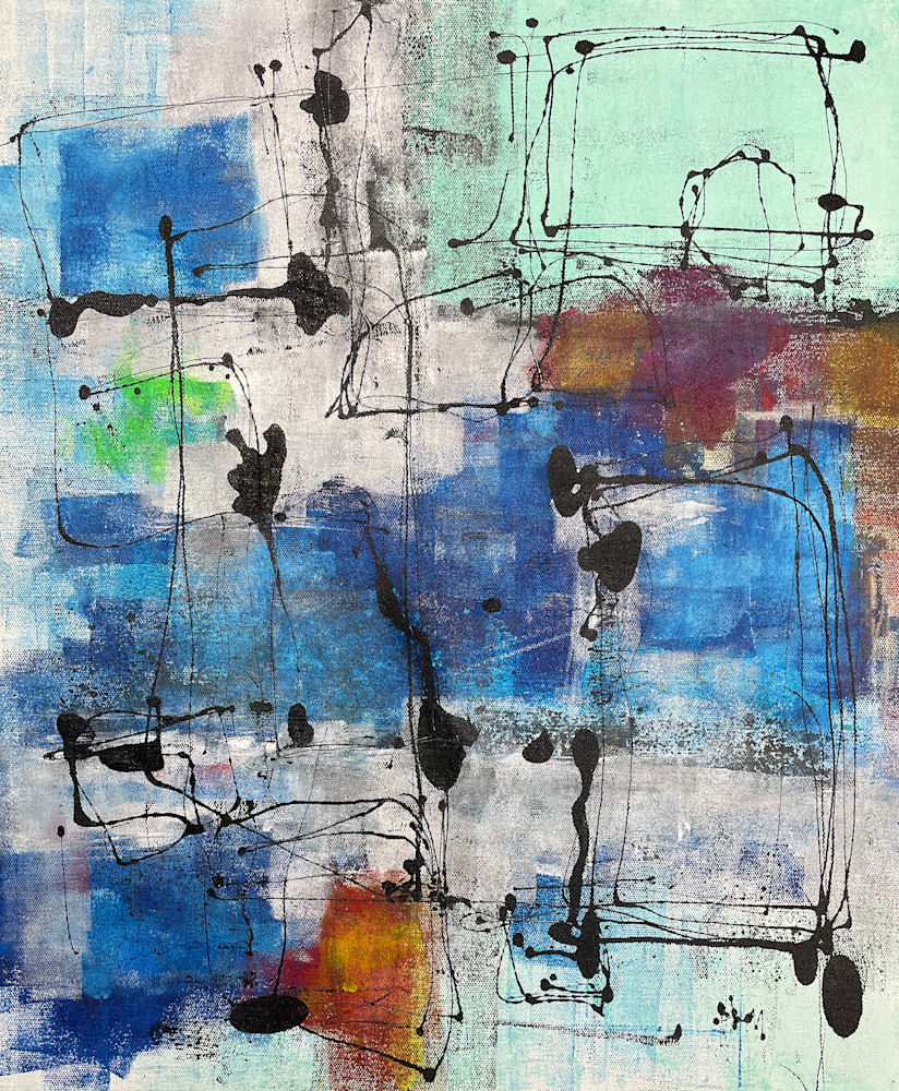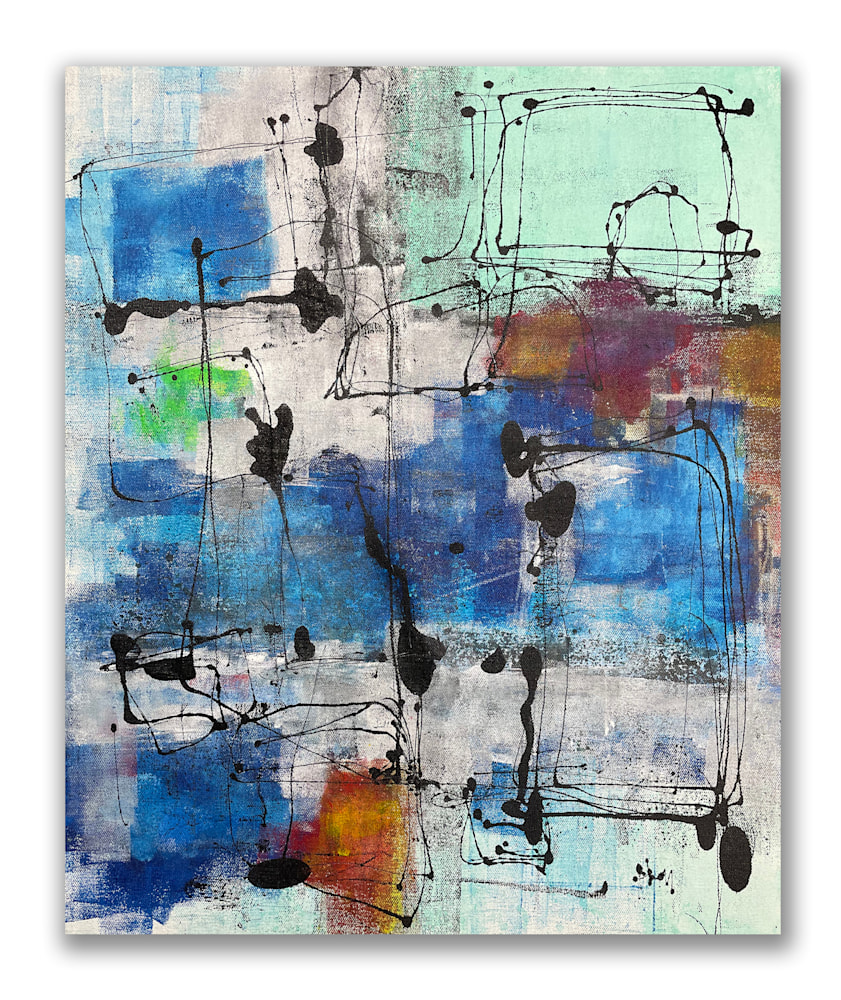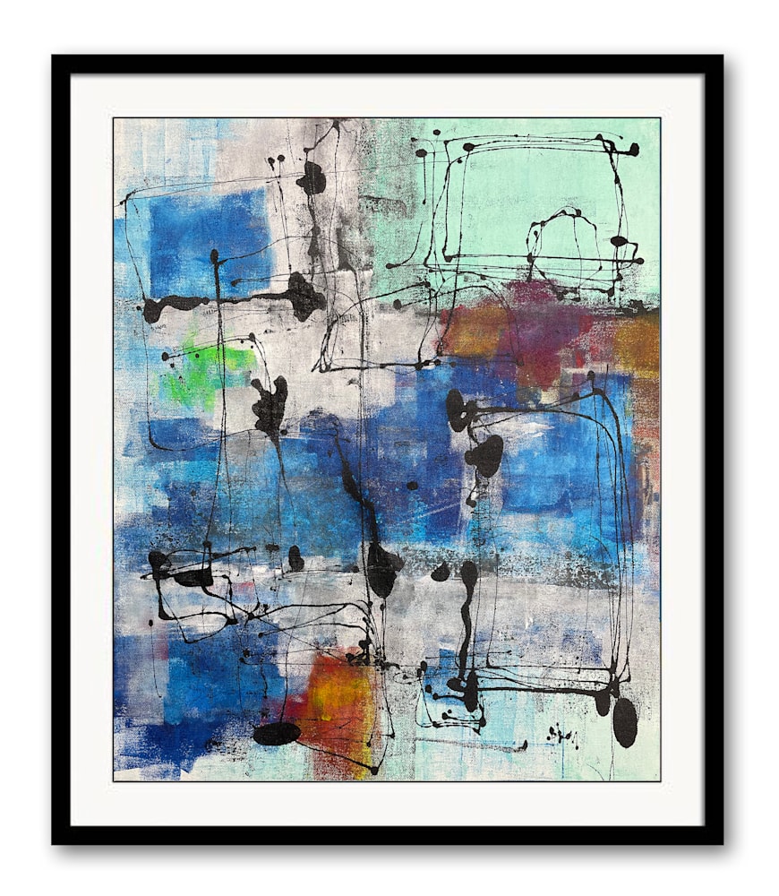 Raw #81 is a brooding piece with hints of hopefulness and positivity.  The tetrad palette makes an interesting color combination under the series' lines and marks.  Framed it makes quite a statement. (Shown for demonstration purposes only.)