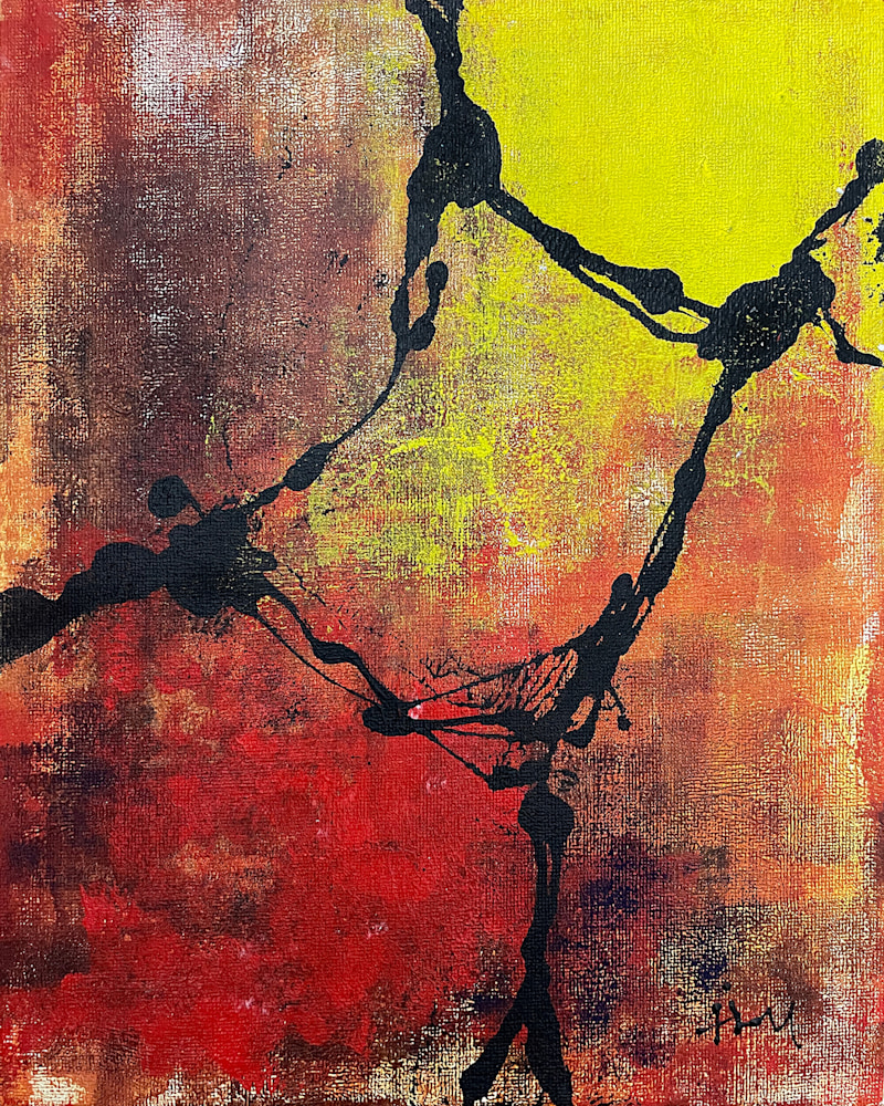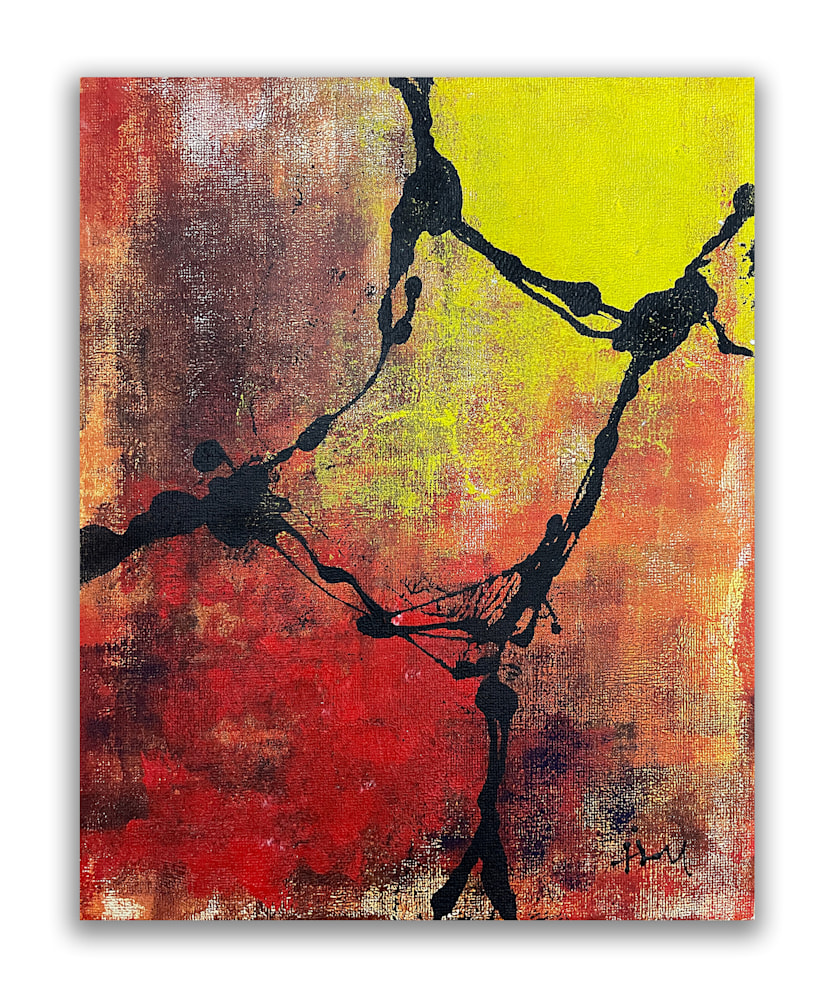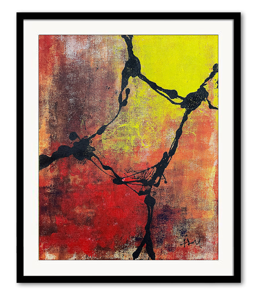 A small piece with stunning color and a strong black contrast versus the yellow.  Warm colors from purple through yellow combine with the black shape and lines of the Raw series to bring about a seriously explosive statement that says "Look at me!".