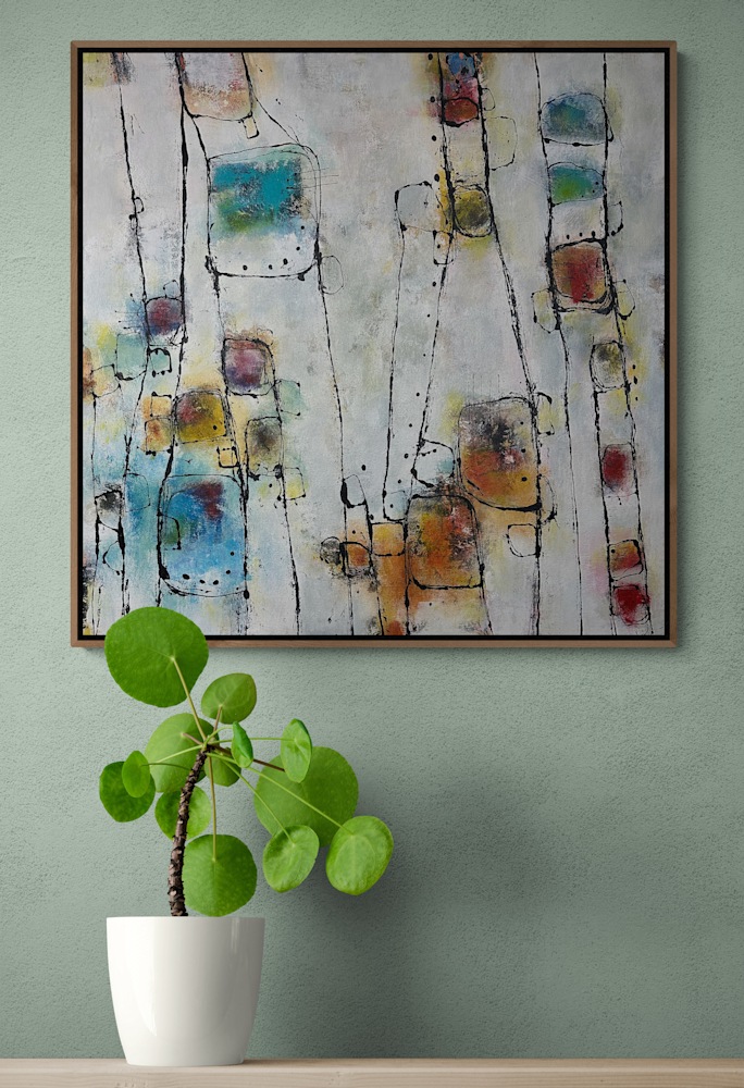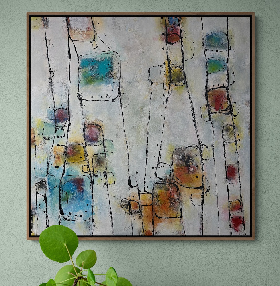 Color, line and shape pretty much says it all.  Abstract take on connections and or connecting.  The title isn't something I had in mind while painting, just something that's been in my head for a while.  Pretty appropriate these days I'd say.